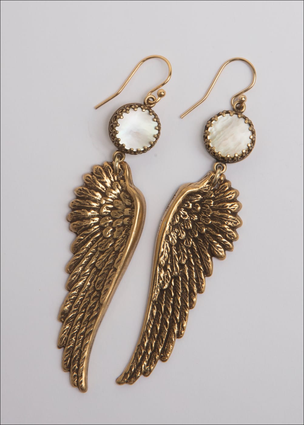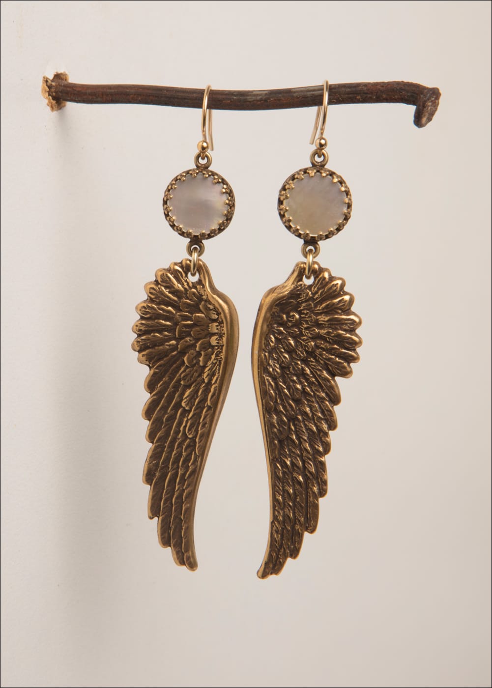 Vintage MOP Cabochon / Plated Gold Wings 3" L / 14kt. G.F. French Wires